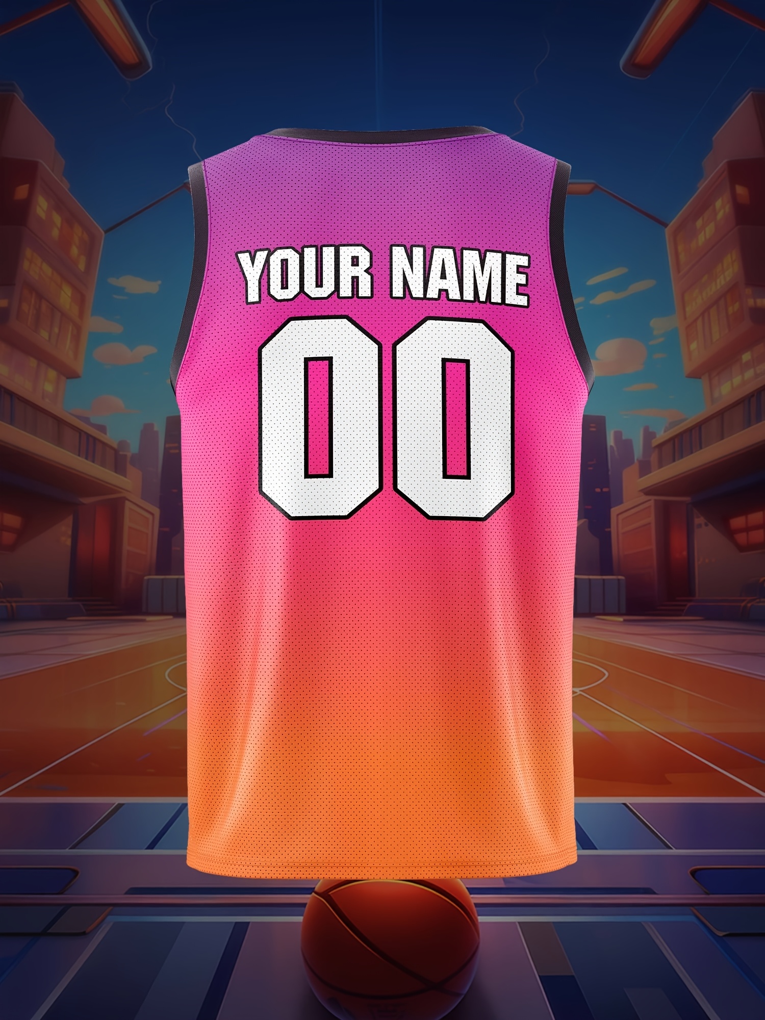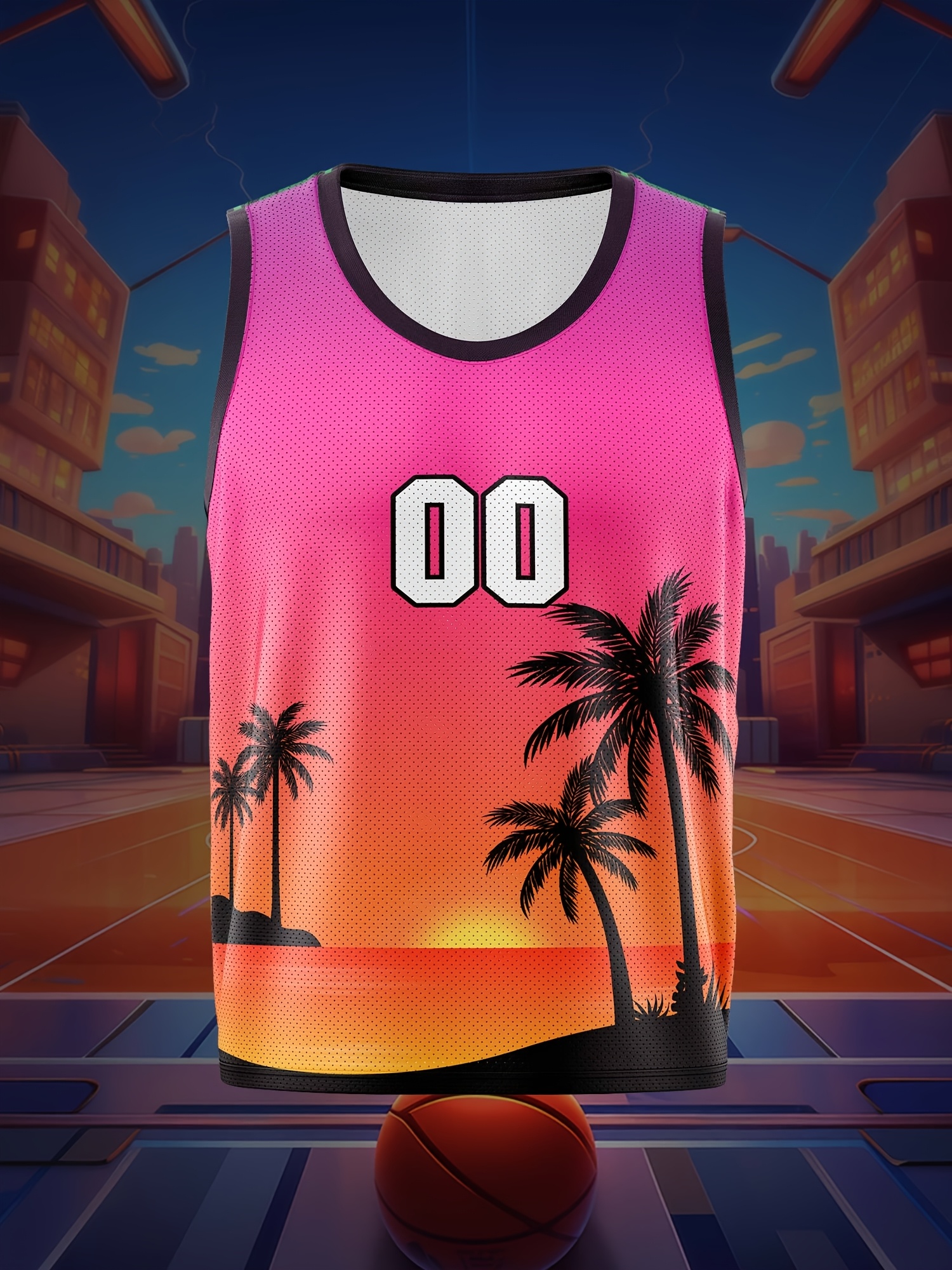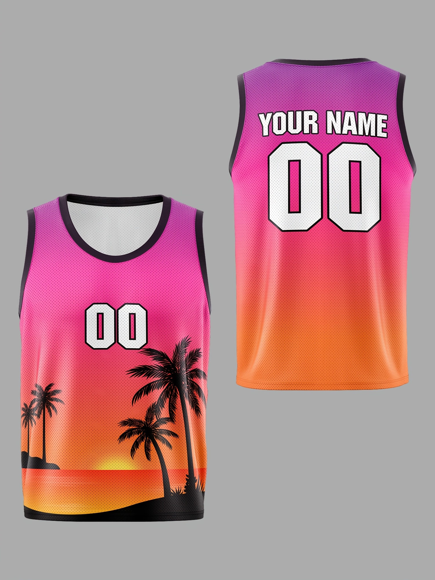 Custom Youngsters' Basketball Tank Top - Personalized Name & Number, Pink to Orange Gradient with Palm Tree Design, Breathable Polyester for Sports, Training, and Outdoor Play